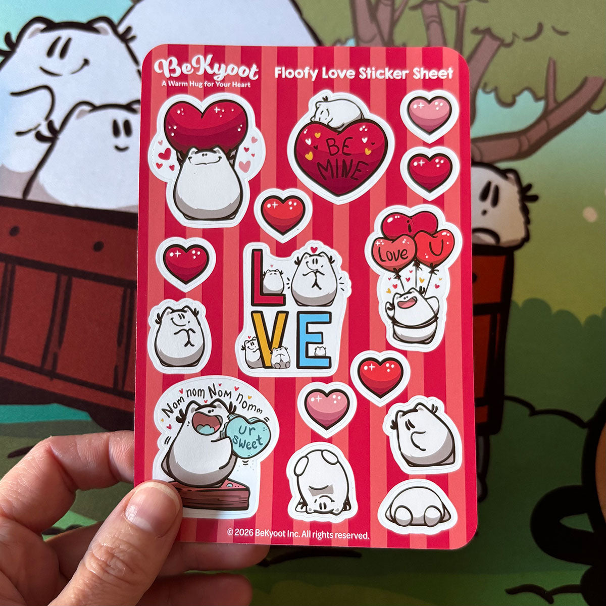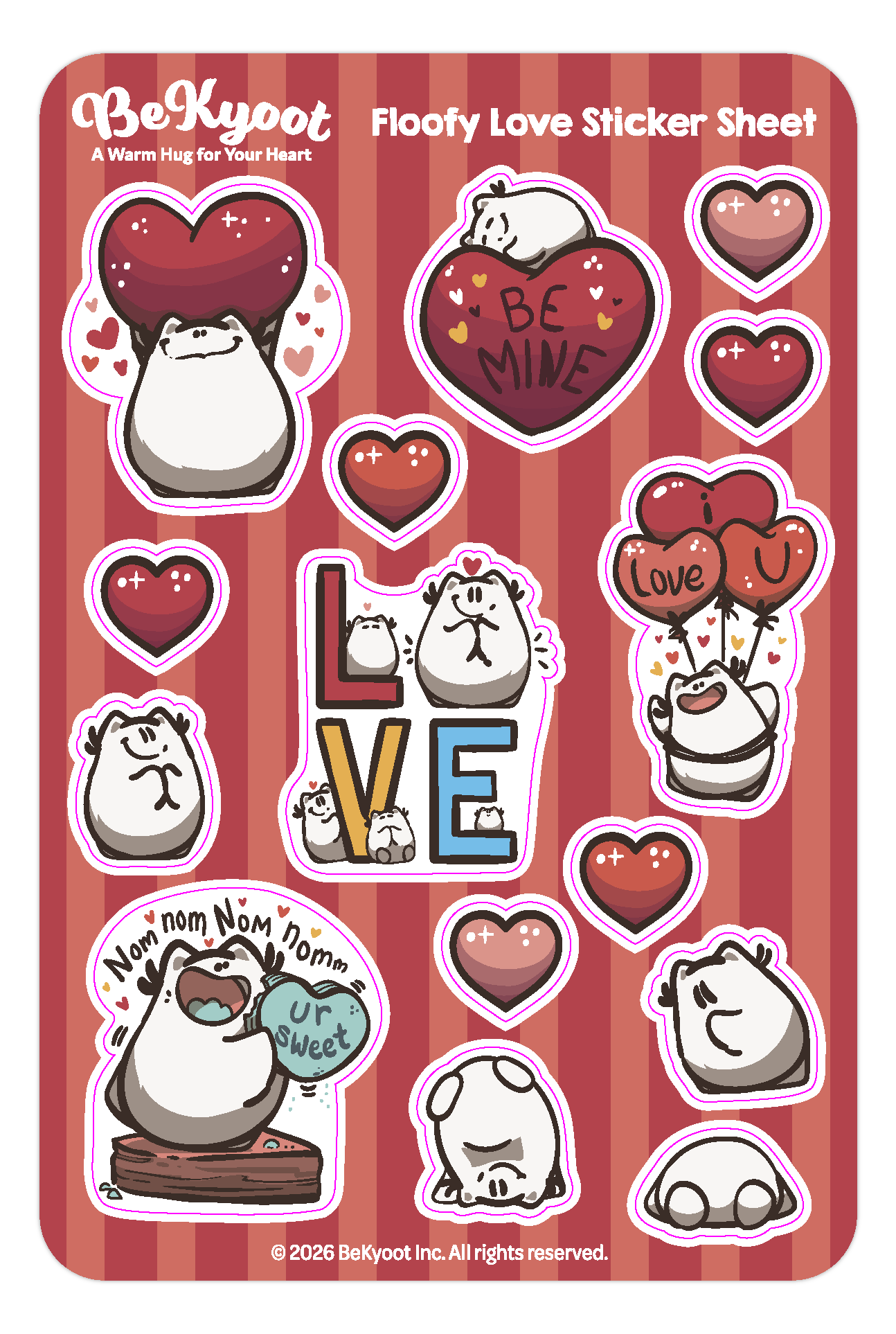 The Floofy Love Sticker Sheet is bright, sweet and full of floofs and love! These stickers are matte laminated, and perfect for use on laptops, notebooks, water bottles and a variety of devices!